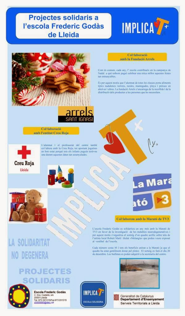 La nostra escola, Frederic Godàs hi va voler col·laborar a favor de la solidaritat explicant, en un dels pòsters que van estar a l'exposició, les activitats solidàries que portem a terme durant aquest mes de desembre, tot col·laborant amb entitats com la fundació Arrels, la Creu Roja i la Marató de TV3.